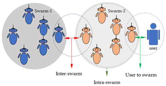 These protocols and hardware structures together with the topologies enable the robots to communicate. However, one more point needs to be mentioned here. The studies generally describe the communication between individuals within the swarm or between the user and the swarm. However, there has been some discussion recently about the existence of more than one swarm. Naturally, considering that swarm robotics will become widespread over time, it is inevitable that there will be different swarms doing different tasks in the same environment. Moreover, these swarms may be heterogeneous swarms that do not have the same structure. In this case, it would be a great waste if the swarms do not work with each other. In cases where communication is not enough, it would be meaningless not to benefit from the individual of the other swarm found on the neighborhood. In this context, recent designs in accordance with