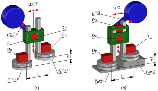 An innovative bipedal robot with swivel feet: DR, DL—drives of feet, FR, FL—swivel feet of robo, DC—drive of robots leg, COG—centre of gravity, L—distance between feet axis, H—vertical move of feet: (a) 3 DOF robot balancing mass moved using DC drive; (b) 4 DOF robot balancing mass moving using DG—independent balancing drive.