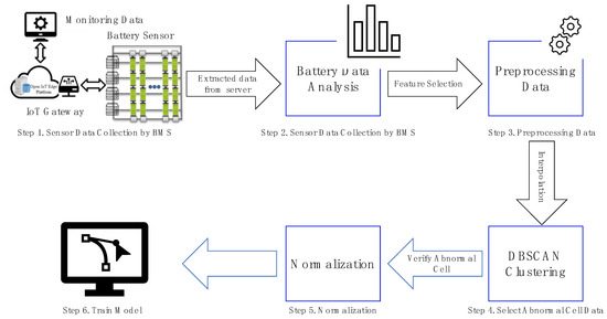 After completing data preprocessing, an abnormal cell was selected for training through Density-Based Spatial Clustering of Applications with Noise(DBSCAN) clustering. To improve the performance of the model, normalization was conducted using MinMaxScaler. The method for verifying abnormal cells is described in Section 3.3.