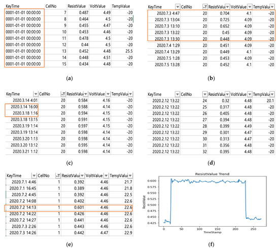 The overall flow of the preprocessing process is shown in Figure 1. The BMS collects data from the sensors. After extracting a certain period of data from the BMS, five features were analyzed: ResistValue, VoltValue, TempValue, KeyTime, and CellNo. Figure 2 lists the order of data preprocessing. First, to obtain continuous data, the KeyTime error and data measured more than twice a day were deleted. At this time, if the data were measured more than twice a day, it is owing to an intervention by the administrator, leaving only the last stabled data and one datum which has an interval of 12 h from the stabled data. Missing data were generated through an interpolation. Similarly, owing to sensor errors, data were generated by the interpolation of unmeasured values. Subsequently, to eliminate the training of false alarm data, the outlier data were deleted, and the cells were separated if the average internal resistance changed owing to the intervention of the administrator.