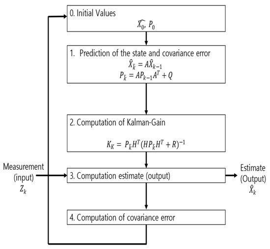 Time-series data generate noise in certain parts, and there is a limit to improving the performance of the model when training data include such noise [14]. Consequently, a Kalman filter, which is widely applied in signal processing and time-series analysis, is used [15]. A Kalman filter is a recursion filter that estimates the state based on noise-containing data and estimates the distribution of the current state variable based on previous measurements. In addition, because the computation process is fast, it is suitable for real-time problems. Moreover, because there is no need to maintain records other than the previous state, it is ideal for systems that require continuous updates. Figure 4 and Table 1 show the applied Kalman filter algorithm and its description.