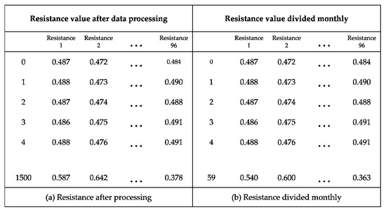 As mentioned earlier, the dataset consists of resistance, temperature, and voltage, as shown in Table 4. Only resistance was used for clustering, and thus the preprocessing data remain, as shown in Figure 5a. Finally, the dataset was divided into monthly units, as shown in Figure 5b.
