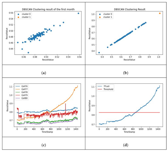 When a cell is clustered as a dangerous cell, it is possible to verify whether it can be correctly distinguished by comparing the resistance with the threshold values. As a result of the performance, cell no. 77 was classified into another cluster, as shown in Figure 6a,b. By printing the data trends, as shown in Figure 6c,d, it can be clearly verified whether the cell is abnormal.