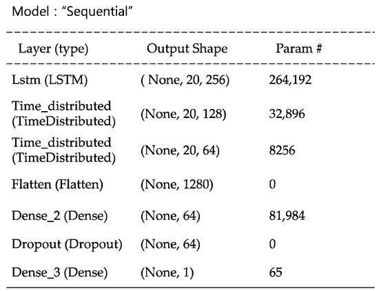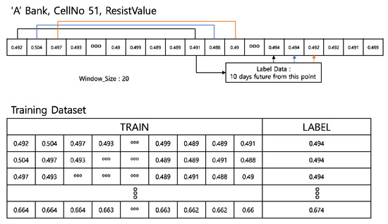 Models optimized for time-series data were used in this study. Typically, RNN and LSTM are used for time-series prediction [21]. For forecasting, data have to be divided by windows, such as in Figure 7, and then it is decided how many data will be trained and which timestamp will be labeled. If the window size is large, more information will be trained, but it can cause a decrease of the sensitivity of the model.