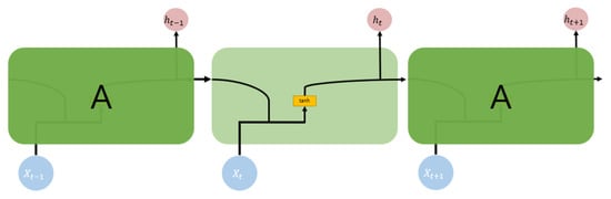 An RNN [22] is a type of artificial neural network in which hidden layers are connected to the edge to form a circulatory structure. Regardless of the sequence length, this has the advantage of creating a structure with flexible inputs and outputs. However, if the distance between the relevant information and the point where the information is used in the RNN is large, the gradient gradually disappears as it reverses. This is called the problem of long-term dependency, which results in a decrease in the training performance. Figure 8 shows the detailed structure of an RNN.