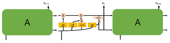 An LSTM [23] is a network designed to solve the long-term dependency problem of an RNN, which is mainly used in natural language processing (NLP). In an RNN-based cell, as shown in Figure 8, the current input and output sequence of the hidden state is used as input, whereas in the case of an LSTM, as shown in Figure 9, the cell has a more complex structure. The forget gate f_t adjusts those data that will be left from the previous state. Because the output range of a sigmoid function is between 0 and 1, it is possible to forget the information of the last state if the value is 0 and to fully remember the information of the previous state if the value is 1. In addition, there is a gate that updates the state based on the current input and an output gate for controlling information that will go beyond the next step; therefore, previous information may remain for a long time.