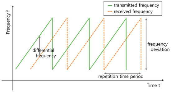 The FMCW radar emits a serrated signal waveform that changes frequency linearly over time (see Figure 1); subsequently, the radar receives the reflected signal from the target. As the distance between the radar and a target generates a propagation delay, the frequency of the received signal differs from that of the currently generated signal; the frequency is proportional to the delay time. Using this relationship, the delay time is obtained from the differential frequency, and the distance to the target can be estimated as follows: