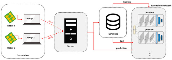- The developed simultaneous location and posture estimation system comprises two FMCW radars and a server to experimentally evaluate the performance of the proposed scheme. The developed system collects the time-series radar data at each location, and the collected data are divided into training and testing datasets to evaluate the proposed DL model.