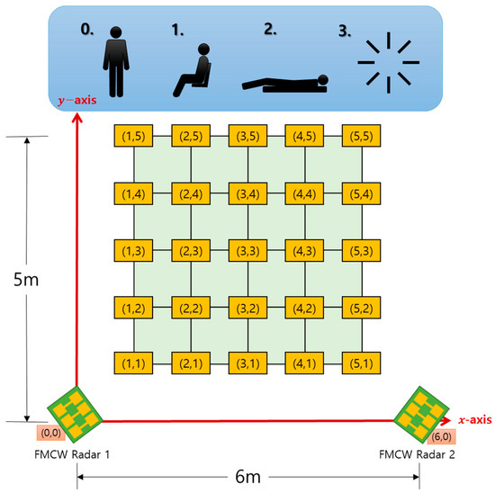 Figure 2 depicts the developed simultaneous location and posture estimation system, which comprises two FMCW radars and a server. Figure 3 illustrates a schematic of the experimental setup used for evaluating the conventional and proposed schemes. As indicated in the figure, two FMCW radars were placed at both ends of the x-axis, and the received data were collected to estimate the location and posture of the human target, positioned at one of 25 different points over a monitoring area of 5 m × 6 m. The time-series radar data were collected using the developed system for the empty state and three different postures at each location. The collected data were divided into training and testing datasets to evaluate the proposed scheme. The same experimental data were used for both conventional and proposed schemes.