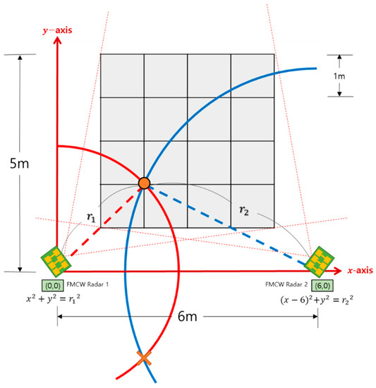 The conventional multilateration scheme for 2D localization is based on the distance estimation between the radar and target. The distance can be calculated by multiplying the estimated delay time with the propagation speed of the radio wave. As the multilateration method is based on range estimation, its localization performance relies on the accuracy of the estimated distance between the radar and target. To enhance the accuracy of delay time estimation, a conventional DL-based distance estimation scheme was employed for the DFL scheme which uses the FMCW radars [29] (Figure 4). Two circles with different radii (r1 and r2) can be obtained using the estimated distance at the pre-determined position of the radars. Subsequently, the intersection of the two circles was determined to be the location of the target, as depicted in Figure 5.
