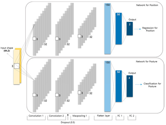 We propose a DL-based DFL scheme for simultaneous estimation of indoor location and posture using 24-GHz FMCW radars. As the data collected from an FMCW radar are composed of 1D signals, the proposed scheme uses a parallel 1D CNN structure with a regression model for localization and a classification model for simultaneous estimation of the location and posture of a target (Figure 6). Each model does not share layers except the input layer, so it can be learned independently and is designed to be easily extended by using the same network form. As depicted in the figure, the input shape for the CNN model using two radars was set to (64,2) as the data from a single radar are collected in an array of size 64 × 1. The same input data were used for both location and posture estimations in the proposed scheme. Typically, inferring that the features of estimating the location are different from those of estimating the posture is considered reasonable. Therefore, a network of parallel structures is proposed to learn the features separately. A category classifier is known to perform well with cross-entropy as a loss function, whereas the least square error is more adequate as a loss function for estimating the values in successive domains. Therefore, the proposed scheme employs the least square error as a loss function for location estimation, whereas cross-entropy is employed for posture estimation. Table 1 lists the best-performing hyperparameters selected based on previous studies [18,29]. A dataset with 19,124 data points was collected for 25 points and divided into training, validation, and test data in the ratio of 64:20:16. The training and validation data were used to learn the proposed DL model, whereas the test data were used to evaluate the performance of the proposed scheme and were not involved in learning. All data points were randomly divided into four classes because if the data are not split by class, an empty class may occur among the four classes. We combined two simple networks instead of building a complex one to make it easy to expand the system. A basic model used in the system is shown in Figure 6. As depicted in the figure, the model for location estimation and the model for posture estimation are exactly same except the output layer. These models are selected because of their simplicity and lightness. As it mentioned above, each model can be trained separately because they do not share layers nor parameters. In the experiment, we trained the model for localization first by the data labeling with locations, and then trained the model for posture by the same data labeling with postures. These models share the same input so they can work at the same time.