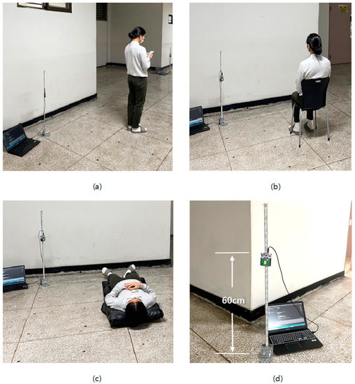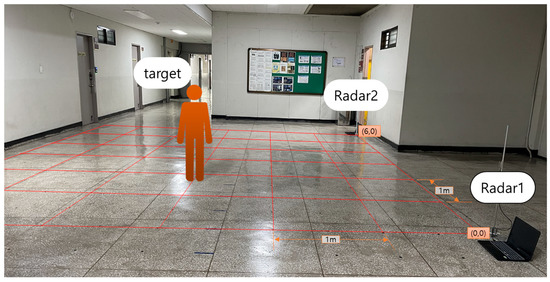 To evaluate the performance of the proposed scheme in actual indoor environments, experiments were performed in a 6.7 m wide, 13.7 m long, and 2.55 m high open corridor on the sixth floor of the general office building at Kwangwoon University. The target in the experiments was a human, and two FMCW radars were placed at each end of the corridor, as depicted in Figure 7. The experiments were conducted by moving the target from point (1,1) to point (5,5), and the data were collected at all 25 points using the two FMCW radars. We performed pre-experiments over 3 months for 30 s, 1 min, 2 min, 3 min, 4 min, and 5 min to decide data collection time. According to the results of experiments, the data were collected for 1 min at each point for three postures, namely standing, sitting, and lying. Furthermore, an additional 100 data points of the empty space were collected in the absence of the target. Figure 8 depicts the three different postures of the target and the FMCW radar configuration fixed at a height of 60 cm from the floor. FFT data from a single radar were collected in an array of size 64 × 1, and the input shape for the proposed CNN model using two radars was set to (64,2).
