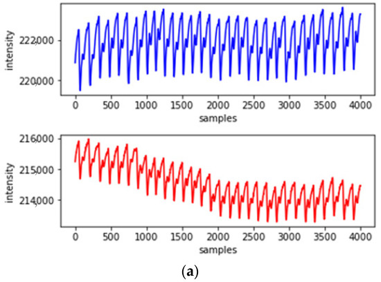 Interference by motion artifacts causes changes in the waveform shape of PPG signals, which lead to corresponding changes in their statistical data. Therefore, we used SG filtering to remove the offset value caused by motion artifacts and subtracted the offset value from the measured PPG signal, thereby acquiring a PPG signal with reduced motion artifact effects [23]. SG filtering is an efficient smoothing and denoising method that performs a weighted moving average, with the weighting implemented as a higher level of polynomial. One of the biggest advantages of this filter is that it preserves the salient features of the maxima and minima that would normally be corrupted by other smoothing filters. Figure 1a illustrates the PPG measurement waveforms at different wavelengths that are affected by motion artifacts; Figure 1b displays PPG signals of different wavelengths with the use of an SG filter that filters the motion artifacts.