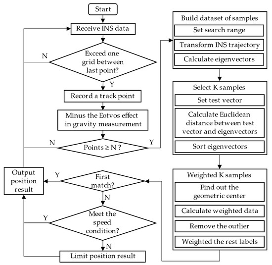 The gravity-matching algorithm based on the KNN method proposed in this paper is stated above. It can be seen from the processes of the algorithm that the proposed method is a kind of sequence iterative gravity-matching algorithm. Additionally, Figure 3 shows the flowchart of the algorithm when it is used in the real-time continuous gravity-aided navigation.