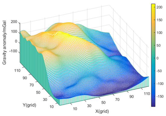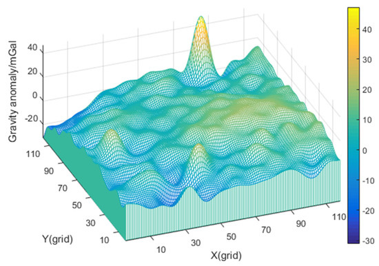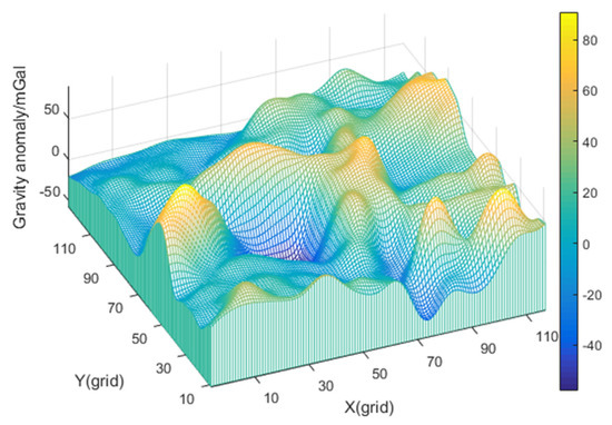 This paper selects a gravity field with weak characteristics, and the distribution is shown in Figure 9. The adaptabilities of the three algorithms to different characteristics are investigated, respectively, by comparing the positioning accuracy.