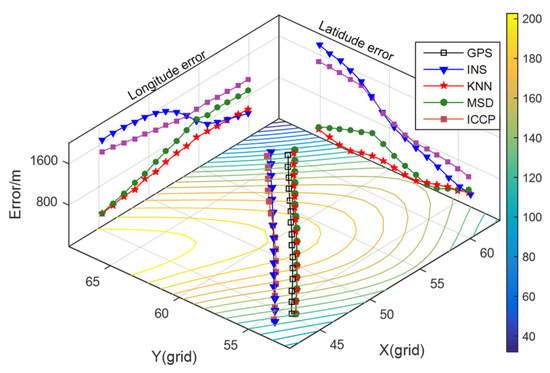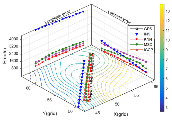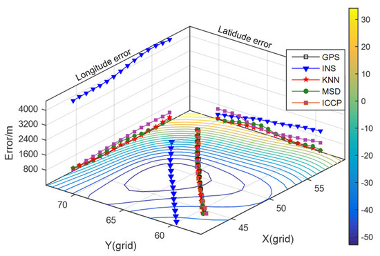 It can be seen from Figure 8 that the positioning errors of INS are less than one grid of gravity map and diverge randomly in the X-axis and Y-axis direction. According to the criteria of matching failure, the MSD algorithm mismatched in the beginning, while the KNN algorithm maintained a success rate of 100% throughout the whole track. From Table 4, the average positioning error of the KNN algorithm is 34.95% lower than that of the MSD algorithm, but the matching trajectory of the ICCP method is close to the INS trajectory. Because the search range of the equivalent point is wide while gravity measurement noise is large, the grid points near the INS points are regarded as the closest contour points. In the iterative process, the matching track is always near the INS track.