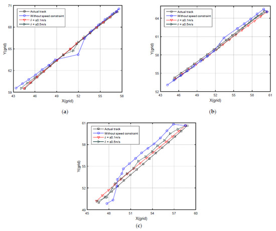 Comparison of speed constraint. (a) Matching results of the track in Section 3.1; (b) Matching results of the track in Section 3.2; (c) Matching results of the track in Section 3.3.