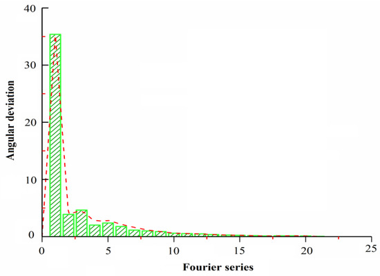In order to further consider the influence of harmonic error on the output signal of the photoelectric encoder, Fourier harmonic analysis was carried out on the sampled signal. The analysis results are shown in Figure 4. It can be seen that the influence of harmonics above the 19th order is approximately negligible. The harmonic errors that can significantly affect the subdivision accuracy of the output signal of the photoelectric encoder are the second, third, and fifth harmonic errors. Therefore, it is further verified that in Formula (12), our error and upper limit for higher harmonics are the fifth harmonic.