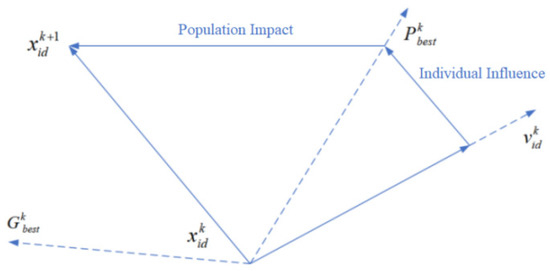 where is the iteration number, is the dimension of the independent variable, and is the inertia weight, which is used to adjust the influence of the upper-dimensional search speed on the current speed. and are random numbers with a value range of , and and are independent of each other. In the variables, is the position vector of particle i at the k-th iteration, and is the velocity vector of the particle at the k-th iteration. is the acceleration weight coefficient of the detected particle itself, and is the weight coefficient of the global acceleration, which is used to adjust the movement speed of the particle at the optimal position of the individual and the overall optimal position. Generally, the coefficient is a constant between . This coefficient can effectively improve the direction and trajectory algorithms of particles in the process of searching for optimal positions. The schematic diagram of particle search displacement is shown in Figure 6.