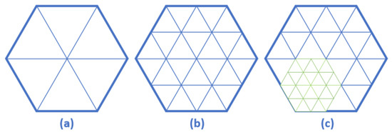 Figure 7. Adaptive sampling area division of the honeycomb structure (D = 6). (a) Partition of particle initial iterative region; (b) 2 iterations to search the domain model; (c) Schematic representation of iterative derivation of the search domain. - As shown in Figure 7b, as the number of iterations in the search domain is accumulated, the number of particles in the individual optimal historical position in the external comparator increases, and the number of particles in the search subspace also increases accordingly, so it is necessary to further subdivide the search area. Starting from iterations, the region adaptive division is performed: