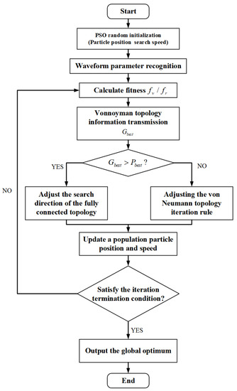 In the particle search process, in order to effectively improve the algorithm’s search ability, it can effectively avoid falling into the “local optimal trap” when dealing with complex iterative problems. Starting from the structural characteristics of different topology types in the iterative process, the von Neumann topology is used as the global topology structure, and the fully connected topology is used as the sub-region population to explore the structure. Taking advantage of the information-sharing characteristics among multi-swarm particles and based on particle fitness, a particle swarm optimization algorithm for multi-structure parallel search is established. The two topology algorithms perform a parallel search for the global and sub-search domains of the population search domain. The particle swarm algorithm compares the local optimum and the global optimum through external memory and uses the comparison results to adjust the iterative strategy. Information sharing between topological structures adopts a secondary communication strategy. After each iteration, the subgroup and the population as a whole share information. At the beginning of each iteration, different population algorithms will detect whether the target population needs to update the evolutionary rules to ensure that the population evolves in the optimal direction and avoids falling into the trap of local optimality. The flowchart of the parallel iterative particle swarm algorithm is shown in Figure 9.