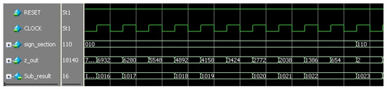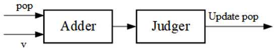 From Formula (25), the particle position update method in the PSO algorithm can be obtained. In the design of the FPGA logic module, a judger is also added to ensure that the particle search process is limited within the search domain. The testing process mainly includes a serial–parallel conversion module, data ROM module, weight–threshold processing module, weight–threshold conversion module, output layer module, subtraction module, and so on. The weight–threshold processing module can split the particles according to a predetermined grid structure. Assuming that the network has node input layers, node hidden layers, and node output layers, the algorithm particle dimension can be expressed as . Convert the weights and thresholds generated by the weight–threshold processing module into a structure suitable for FPGA logic calculation. In order to facilitate parallel computing, the weights and thresholds generated by the weight–threshold processing module are converted into parallel output data. The input of the serial–parallel conversion module is the global optimal individual after the iteration is completed, and the subtraction module calculates the difference between the test data and the simulation data. The particle position update FPGA module is shown in Figure 12.