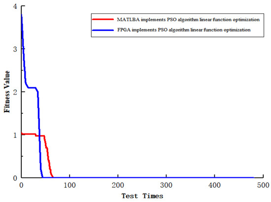 In order to test the performance superiority of the FPGA platform, under the same experimental conditions, FPGA and MATLAB are used to realize the fitness of the PSO algorithm to de-encode sampling data function optimization. The test results are shown in Figure 14.