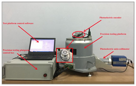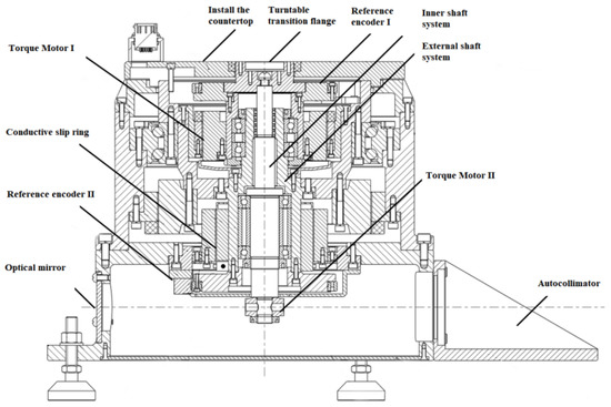 In order to cooperate with the verification test results, a photoelectric encoder error detection platform is designed as a special error detection and compensation device. The internal structure of the subdivision error detection and compensation platform is shown in Figure 15. The platform uses an autocollimator and a regular tetrahedron to form an optical position closed loop as an angle reference, and a fixed-position optical reflection device is also installed to detect the signal drift of the autocollimator during the process. The detection device can perform ±360° continuous or fixed compensation detection, and adopts an internal and external dual-axis structure. The positioning accuracy of the angular position of the inner and outer shafts is ±0.2″, the angular position stability is ±0.36″, the verticality of the shaft system and the axis rotation accuracy error are ≤±2″, and the angular position resolution is ≤0.36″. The detection device consists of a detection platform and a control box that can transmit the collected data to the host computer in real time for display. The size of the inner table at the top of the detection device is designed to be Φ210 mm, and the material is super-hard aluminum alloy. The flatness of 0.005 mm and the runout of the end face of 0.01 mm are guaranteed by grinding the table surface and the installation positioning surface. Load-mounting screw holes are arranged on the table, and by matching the clamping flanges with corresponding dimensions, the detection of encoders of any size with a diameter of less than 210 mm and a single weight of less than 2.5 kg can be realized. The structure designed in this paper can form an optical closed-loop detection structure and has a relatively low cost to complete higher-precision detection, which effectively improves the detection efficiency and accuracy. The system structure of the subdivision error detection and compensation platform is shown in Figure 16.