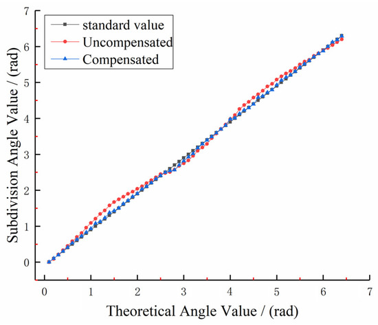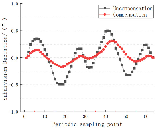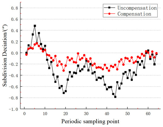 It can be concluded from Figure 19 that the maximum value of the subdivision error before compensation is +0.48″, the minimum value is −0.78″, and the peak-to-peak error is 1.26″; after the algorithm compensation, the subdivision error value is significantly reduced, the maximum error value is +0.16″, the minimum error value is −0.31″, the peak-to-peak error is 0.48″, and the subdivision accuracy is significantly improved. In addition, a small numbers of systematic errors and random errors of readings are still included in the detection of subdivision errors using the precision error precision-measuring platform.