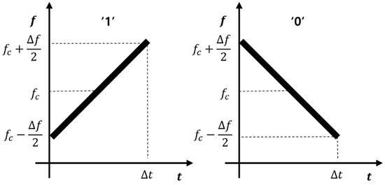 The keying modulation method proposed in this paper was implemented using a frequency sweep. As shown in Figure 1, the frequency rising sweep was defined as “1” and the frequency falling sweep was defined as “0”. Equation (1) shows the frequency according to the frequency sweep time and Equation (3) shows the transmitted ultrasonic signal when transmitted to an ideal transmitter without a bandwidth limitation.