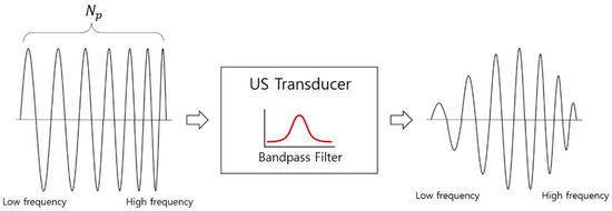 The signal power in the center frequency band is strongest when a frequency sweep is performed because of the bandwidth limitation of the ultrasonic transducer, as shown in Figure 2, and sharp signal attenuation occurs outside the bandwidth. Therefore, if the frequency sweep range, , is set too wide, the ratio of the time of the area where the signal size to the time of the one-bit signal is small increases, which is not good. Therefore, considering the bandwidth of the ultrasonic transducer, the frequency sweep range should be selected within the frequency section in which the signal amplitude is −20 dB compared to the center frequency.