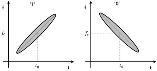 where Q is , which means the Q value of the filter. The reference signals and are then converted into signals and on the spectrogram using Equations (1)–(3). From and , the part corresponding to the frequency and time domain of interest is composed of the reference cross-correlation masks and . The frequency domain of interest corresponds to the sweep frequency range and the time domain of interest corresponds to the transmission time of one bit