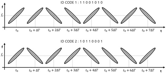 This is a transmission method by changing the frequency of ultrasonic transmission pulses based on the center frequency according to the ID code. In the case of broadband ultrasonic transducers, energy efficiency and modulation/demodulation performance are excellent. In the case of a narrowband ultrasonic transducer, however, the energy efficiency is not good because it transmits using a frequency deviating from the center frequency , and SNR degradation and sensing range are reduced. No interference between code “1” and code “0” occurs during signal overlap. Related studies include [34,35].