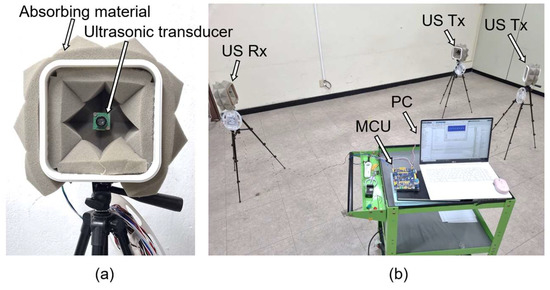 Figure 6a shows the ultrasonic transceiver used in the experiment. The ultrasonic sensor uses Hagisonic’s HG-L40DC, has a bandwidth of 4 kHz, and a directivity angle of 65° at a center frequency of 40 kHz. In addition, the effect of multipath fading and reverberation was minimized by attaching an ultrasonic sound-absorbing agent around the ultrasonic sensor to absorb ultrasonic waves other than the line of sight. As shown in Figure 6b, an ultrasonic signal interference environment was constructed by configuring multiple transmitters in one receiver in an indoor environment 10 m in width and 10 m in height. Table 1 lists the parameter values used in the experiment.