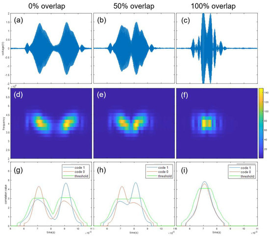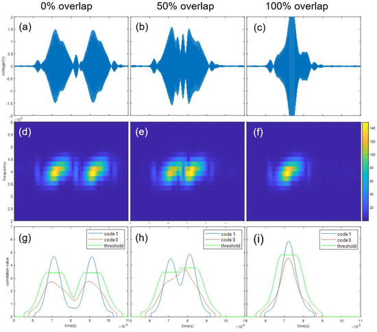 Demodulation results when two transmitters transmit the same bit codes, “1” and “1”. Shown are (a,d,g)—0% overlap; (b,e,h)—50% overlap; (c,f,i)—100% overlap; (a–c)—received signal; (d–f)—spectrogram; and (g–i)—code mask correlation result and threshold value.