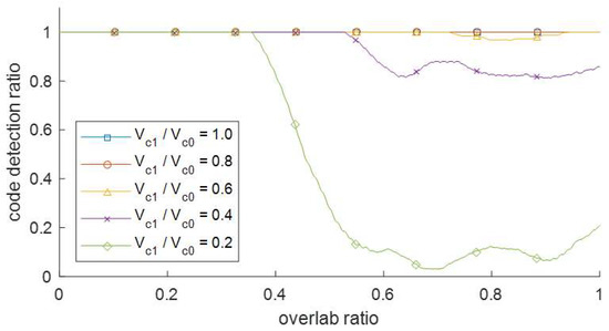 A code with a small power length is difficult to demodulate when two signals with a large difference in signal power are mixed. Therefore, an experiment was conducted to determine the code detection ratio according to the difference between the two signal powers. The distance of the transmitter was adjusted so that the ratio of the code 1 signal voltage to the code 0 signal voltage was 1.0, 0.8, 0.6, 0.4, and 0.2, and the overlap was randomized by adjusting the time delay. In the case of code 0, the signal power was strong and it was always received. In the case of code 1, which has a weak signal power, as shown in Figure 9, the code detection ratio rapidly decreased when the signal power ratio was lowered to less than 0.4. When the signal power ratio was 0.2, the code detection ratio decreased to approximately 10% at an overlap of 40% or more. In this case, it was impossible to detect a signal code in a multi-code because the detection ratio is low at 50% or more of overlap. In conclusion, in the proposed frequency sweep keying, the demodulator operates normally at a signal power ratio of 0.4 or higher.