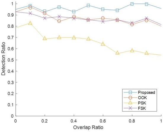 Second, an experiment was conducted to verify that the proposed method is more robust than the existing method even in the signal overlap situation. In the same experimental environment as the first experiment, the overlap ratio of the mixed signal was adjusted by changing the transmission time point to the two transmitters. If the TOF error was less than 1 ms, it was judged that the code detection was successful. Figure 10 shows the experimental results. The detection ratio was calculated by measuring each 100 times in 10% units from 0% overlap to 100% overlap. As a result of the experiment, the proposed method showed a detection ratio of 0.93 or more regardless of the overlap ratio. However, in the case of the existing method, the detection ratio tended to decrease as the overlap ratio increased. In particular, in the case of PSK, the decrease was even more pronounced.