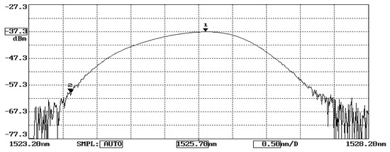 The working principle of FBG sensors exists according to the correlation between the Bragg wavelength shift and the temperature change and applied strain, as presented in Equation (2). A wavelength meter is widely employed to measure the wavelength. However, a slow response of the wavelength meter is inappropriate for online and real-time measurements. In this study, the Bragg wavelength shift is converted to a modulation of light power through an optical band pass filter and detected by a photodetector. The fast response of a photodetector provides the feasibility of the measurement for real-time responses. The proposed FBG sensing system is schematically illustrated in Figure 2. The sensing system is composed of a broadband light source (ASE 1550A, Faztec Optronics Corp., Taipei, Taiwan), an optical circulator, an optical band pass filter (TBF-1550-1.0, Newport Corp., Irvine, CA, USA) and a photodetector (ET3010, Throlabs Inc., Newton, NJ, USA). The initial Bragg wavelength of the FBG sensor used in this study is 1524.66 nm, as shown in Figure 3, while the range of the optical band pass filter is 1523.8~1527.2 nm, as shown in Figure 4. When a broadband light is transmitted to the FBG, a narrowband spectrum of the Bragg wavelength is reflected back from the FBG sensor and guided into an optical band pass filter. The light power is modulated by the optical band pass filter according to its wavelength. To ensure the one-to-one correspondence between the wavelength and light power, the Bragg wavelength reflected from the FBG sensor was restricted to a range of 1523.8~1525.7 nm in this study. In this wavelength region, the output of the light power from the optical band pass filter increases with the increase of the wavelength. Thus, a one-to-one correspondence between the temperature and light power can be achieved. In this work, a Bragg wavelength of 1524.66 nm was used for the FBG sensor since it falls in the valid region of 1523.8~1525.7 nm. The light power is converted to an electrical voltage through a photodetector, yielding to the determination of the temperature.