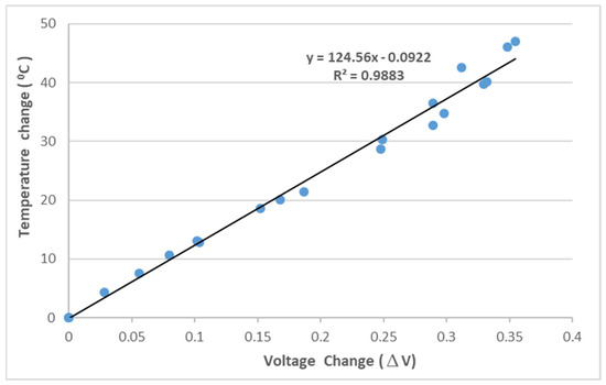 To correlate the temperature with the light power, experimental tests of an FBG sensor adhering to a steel beam under a series of temperature changes were conducted. The Bragg wavelength of the FBG sensor used in this study at its initial state is , as shown in Figure 3, which is in the left half region of the optical band pass filter, as shown in Figure 4. The output light power of the optical band pass filter increases with the increase of the temperature due to the increase of the Bragg wavelength reflected from the FBG sensor. In the experimental tests, the test specimen was heated from room temperature to in a thermal chamber. The temperature change and light power change were recorded and plotted in Figure 5. The linear relationship fitting between the temperature change and light power variation exhibits a reasonable linearity, with the coefficient of determination being approximately 0.99. The linear relationship between the temperature change and light power variation ΔV is obtained as follows: