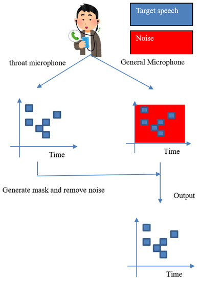Figure 1 shows an overview of the proposed method. In our supposed scenario, we record the sound with a general microphone and a throat microphone simultaneously. We then create a binary mask based on the speech data obtained from the throat microphone to remove noise from the speech data obtained from the general microphone.