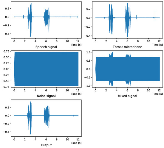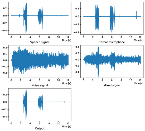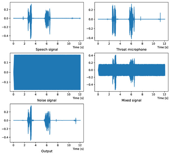 The effectiveness of the method proposed in Section 2 is evaluated by experiments. In this study, the accuracy of the noise removal is verified by creating the target speech, noise speech and mixed speech in advance. For the noise, we used sound effects from the Sound Effects Lab [27] and Hashimoto Research Institute [28]. Recorded speech was used as the voice. Recording with the general microphone and throat microphone was performed at the same time in a normal quiet room. The used general microphone was M4U made by inMusic, Inc. (Cumberland, RI, USA). The used throat microphone was DN-915129 made by ThirdWave Co., Ltd. (Tokyo, Japan). To evaluate the noise reduction performance quantitatively, the mixtures were created on a computer. All programs were written in Python.