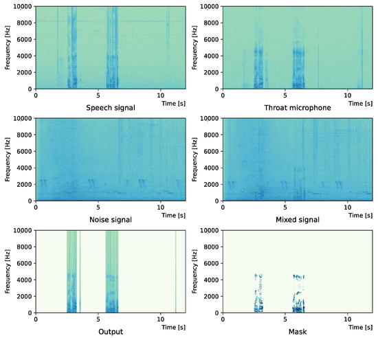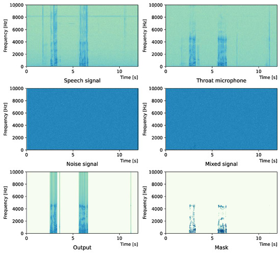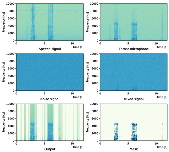 We also note that the delay between the throat microphone and the general microphone is not taken into account. The main reason is due to the difference between the typical binary mask usage scenario and the proposed method usage scenario. In the typical binary mask usage scenario, the speaker is apart from the listener, and the listener records the sound from the speaker. The proposed method aims to record the speaker’s voice clearly in a situation where the surroundings are extremely noisy. Since this work is performed on the speaker side, it is assumed that recording with a microphone and a throat microphone will be performed at the same time.