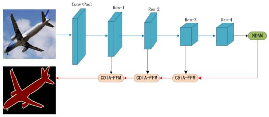 Overview of MANet for semantic segmentation. We use ResNet101 to extract dense features. We use NDAM to effectively capture long-distance contextual information and use CDIA-FFM to fuse features at different stages. The blue and red lines represent the downsample and upsample operators, respectively.
