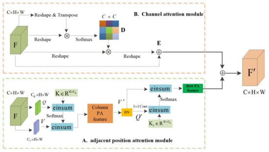 We propose the Adjacent Position Attention Module (APAM) to enhance the representative ability of pixels. As shown in Figure 3A, the Adjacent Position Attention Module applies two convolutional layers with 1 × 1 filters on F to generate two feature maps Q and V, respectively. The Adjacent Position Attention Module is completed in two steps: (1) The feature matrix and the matrix K are used for einsum operation to obtain the column attention map, and the operation result is used for the einsum operation with the feature matrix . This process is equivalent to taking the column attention. The force weight is assigned to the input feature, so that the attention feature map is obtained, and then the normalization process is performed; (2) Perform the einsum operation on the feature matrix and feature matrix to obtain the row attention map, and the weight of the row attention map is assigned to the features with column attention through the einsum operation, thereby obtaining a global dependency.