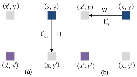 The Adjacent Position Attention Module can capture contextual information in the horizontal and vertical directions. The feature map passes through the column attention layer and the row attention layer to form a global spatial attention module. As shown in Figure 4, all pixels from x to in (a) are calculated for the similarity of adjacent pixels in the same column, and the context information of H pixels in the same column is obtained. The feature map passes through the column attention layer (a), and the output result is after the line attention layer (b); all pixels from y to in (b) are calculated for the similarity of adjacent pixels in the same line, the W pixel context information of the same peer is obtained, so the pixel in Figure 4 obtains the context information of the H × W area, that is, each pixel in the attention module of the adjacent position can collect the context information of the H × W area to generate new features with dense and rich contextual information.