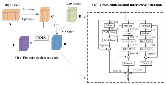 As shown in Figure 5b, we embed the cross-dimensional interactive attention into the feature fusion module. The high-level feature A reduces the dimensionality through a 1 × 1 convolutional layer, and then increases the size of the feature map through upsampling to obtain feature map C of the same size and dimension as the low-dimensional feature map; feature map C and the low-level feature map B perform cat and 3 × 3 convolution operations to obtain feature map D, which enables the simple fusion of high-dimensional features and low-dimensional features, then performs the cross-dimensional interactive attention operation on the feature map D to highlight the information of the fusion feature map and obtains a feature map that integrates semantic information and location information. Cross-dimensional interactive attention can not only capture the dependencies between different dimensions but also highlight the semantic information in high-dimensional features and detailed information in low-dimensional features. The whole network has carried out a total of three high-level and low-level fusions. According to the size of the feature map, the size of the convolution N × N in the cross-dimensional interactive attention mechanism is different. The convolution sizes of the three fusions are 3 × 3, 5 × 5, and 7 × 7; convolution expands as the size of the feature map expands, which is conducive to expanding the receptive field.