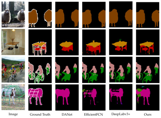 To obtain a better segmentation effect, we combined the NDAM and CDIA-FFM to form MA-FFNet, as shown in Table 4. We compare MA-FFNet with some of the existing semantic segmentation networks, such as [8], DeepLabv3+ [9], OCRNet [17], EfficentFCN [33], and Bisenet v2 [34]. Our segmentation effect is 3.1% higher than that of the basic network, and the effect is higher than the comparison network under the same experimental conditions, so our network is feasible. We randomly visualized several segmentation results. As shown in Figure 7, it is obvious that the segmentation effect of our network is better. Comparing the chairs, bicycles, and sheep legs in the figure, all can prove the effect of our segmentation network.