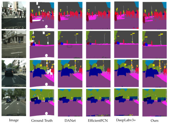 To understand our model more deeply, we visualized the effect of semantic segmentation, as shown in Figure 6. The first and second columns represent the original image and the label image, respectively. The third column and the fourth column, respectively, represent the DANet and NDAM segmentation results. In the segmentation result of the first image, our model has a more complete contour of the rider. The shape of the bicycle is more obvious in the segmentation result of the second image. In the segmentation result of the third image, our model has fewer red error segmentation pixels. This verifies the effectiveness of the cross-dimensional interactive attention fusion module, which makes the boundary and contour of the target object in the segmentation result more perfect. Overall, the NDAM segmentation results are better.