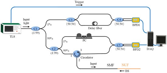 The system schematic of the optical frequency domain reflectometry. TLS: tunable laser source; C1-5: couplers; BPD1-2: balanced photodetectors; PC: polarization controller; DAQ: data acquisition; SMF: single-mode fiber; NCF: no-core fiber; BS: back scattering.