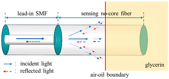 Figure 2 shows the proposed sensor structure for liquid-level sensing. An NCF with its coating removed is spliced with a lead-in SMF, which is directly used as the liquid-level sensing fiber. The NCF can be regarded as a multimode fiber with air cladding. When the NCF is immersed in the oil liquid, the light will quickly leak into the oil due to the higher refractive index of the oil than that of the silicon dioxide. At the oil–air interface, the evanescent field is reflected back and coupled back to the NCF as the back-propagating modes. When NCF is inserted into the oil solution, the light is guided out, and the Fresnel reflection occurs at the oil–air interface: